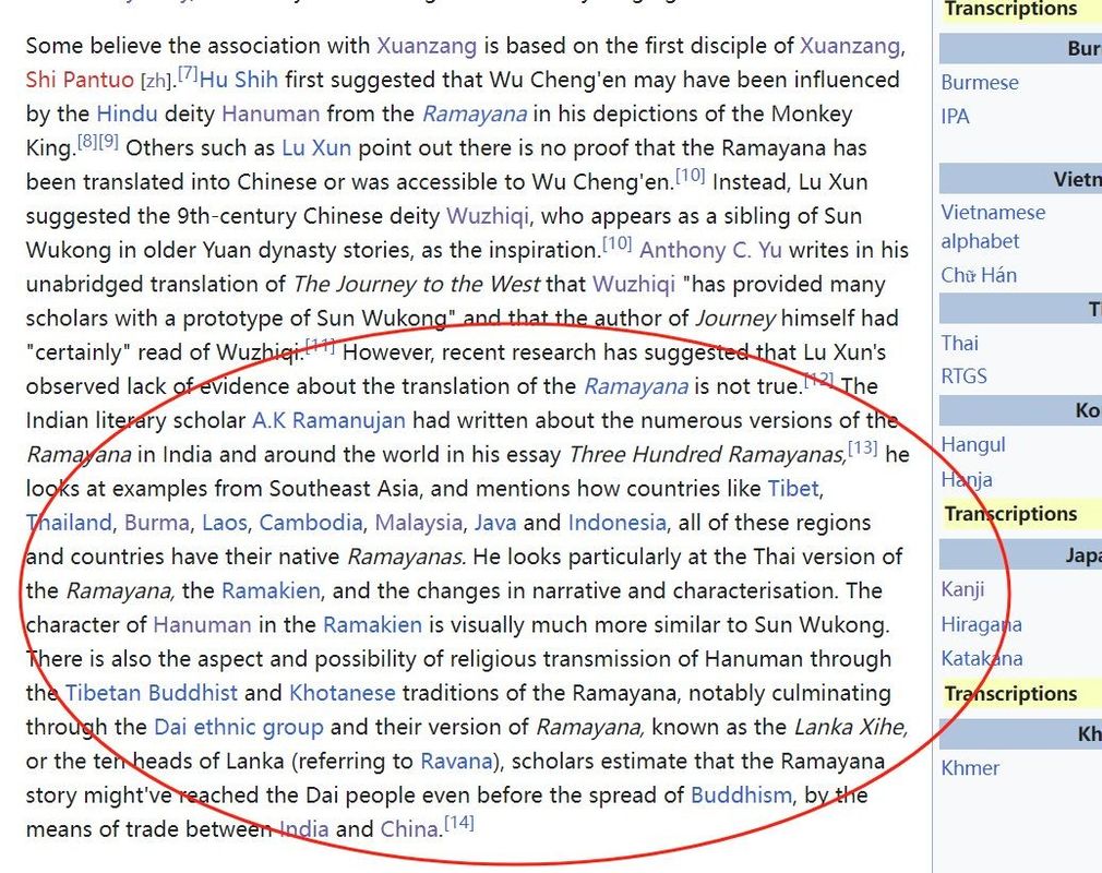 这名网友表示:“原本英文版维基百科上关于孙悟空词条,只是简单的说胡适曾经认为孙悟空原型是印度的哈努曼。但是鲁迅之类的其他学者否认这个说法,认为哈努曼的传说并没有翻译到中国,而是认为孙悟空原型是无支奇。结果《黑神话》发售后大概十月份,印度人就把这段编辑成了,现代学者普遍认为鲁迅的说法是错的。有大量研究证明哈努曼传说传到了中国”,然后说孙悟空的故事和哈努曼的故事非常接近,比起其他所有可能的原型都更接近哈努曼。”