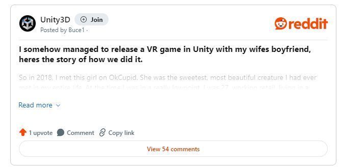 标题党还是钓鱼党?反正宣传目的是达到了。日前一位老外游戏开发者在reddit上发帖,称“与妻子男朋友合作开发游戏已经正式推出”,引发大批网友跟风热议。