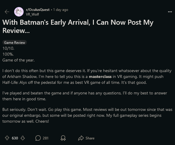 在 Oculus Quest 板块中,用户 VR_Wolf 表示游戏是满分10 分,并且是年度游戏:“如果你对《阿卡姆之影》的质量有任何犹豫,我可以告诉你,这是大师级的 VR 作品。对我来说,它可能会取代《半条命:艾利克斯》成为史上最棒的 VR 游戏。那就太好了。”