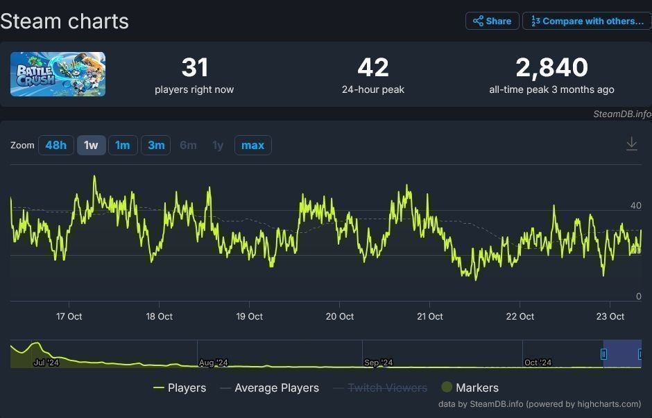 而《BATTLECRUSH》是一款免费游戏,除了 Steam 以外游戏也登陆了移动平台,但仅 Steam 平台游戏一天最多只有42 人同时在线。