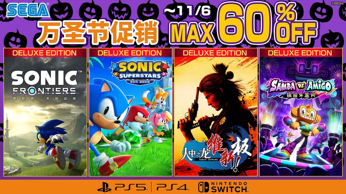 世嘉股份有限公司现正举办“SEGA万圣节促销”活动,在PlayStation™Store和Nintendo eShop内销售的部分PlayStation®5/PlayStation®4/Nintendo Switch™游戏以限时特惠价回馈玩家。
