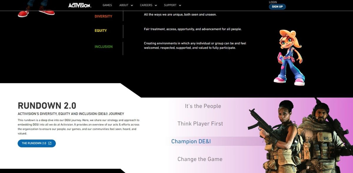 动视已更新官方网站,以表示对DEI的支持。官方甚至制定了完整的“Rundown 2.0计划”,确保今后所有项目都包含DEI。其有三个要点:员工之间的包容性、动视的游戏和多样化的受众。