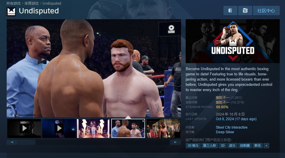 独立拳击游戏《无可争议(Undisputed)》在上市第一周就售出了超过 100 万份。这是多年来第一款大型拳击游戏,最初于 2023 年 1 月以抢先体验形式发售,并于今年10 月 11 日正式推出,登陆了 PC、PS5 和 Xbox Series X|S 平台。