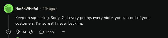 另一位用户 NotSoWishful 则写道:“你就继续压榨吧索尼。不停从客户身上挤出每一分钱。我相信这绝对不会反噬的!”