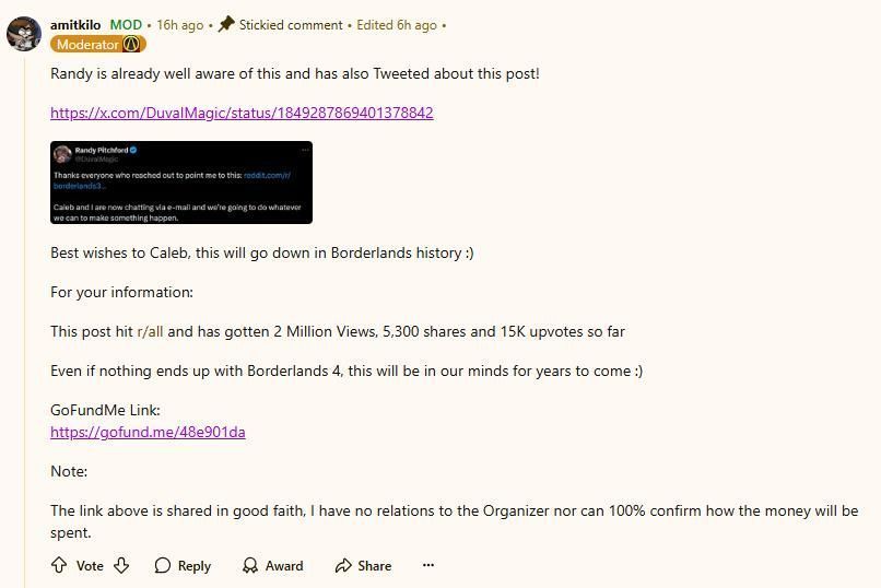 虽然Caleb知道这种事情的可能性并不大,但他还是想尝试一下。而好消息很快传来,《无主之地》系列的开发商Gearbox的CEO Randy Pitchford得知了此事,他在推特上发文表示已经与Caleb通过电子邮件联系上了,并且承诺“会尽一切可能去达成”。