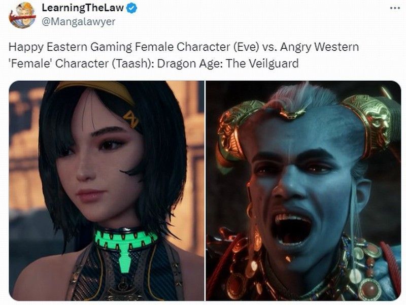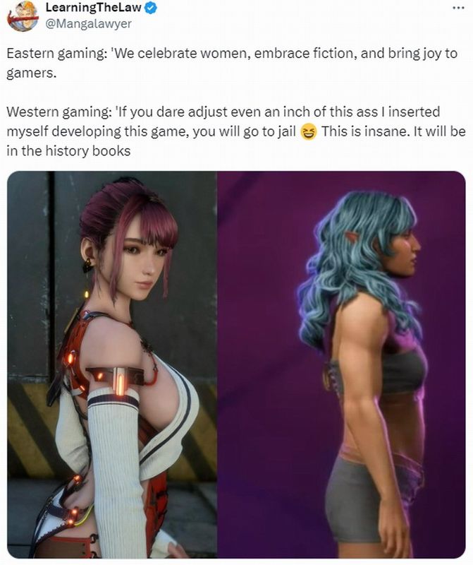 近日游戏博主Mangalawyer将东方游戏《星刃》和西方游戏《龙腾世纪4》角色进行了对比,并调侃:“东方游戏:‘我们赞美女性,拥抱虚构,为玩家带来乐趣’,西方游戏:‘如果你胆敢调整我设计角色的屁股,哪怕是一英寸,你都会去坐牢’。这太荒谬了,这将载入史册。”
