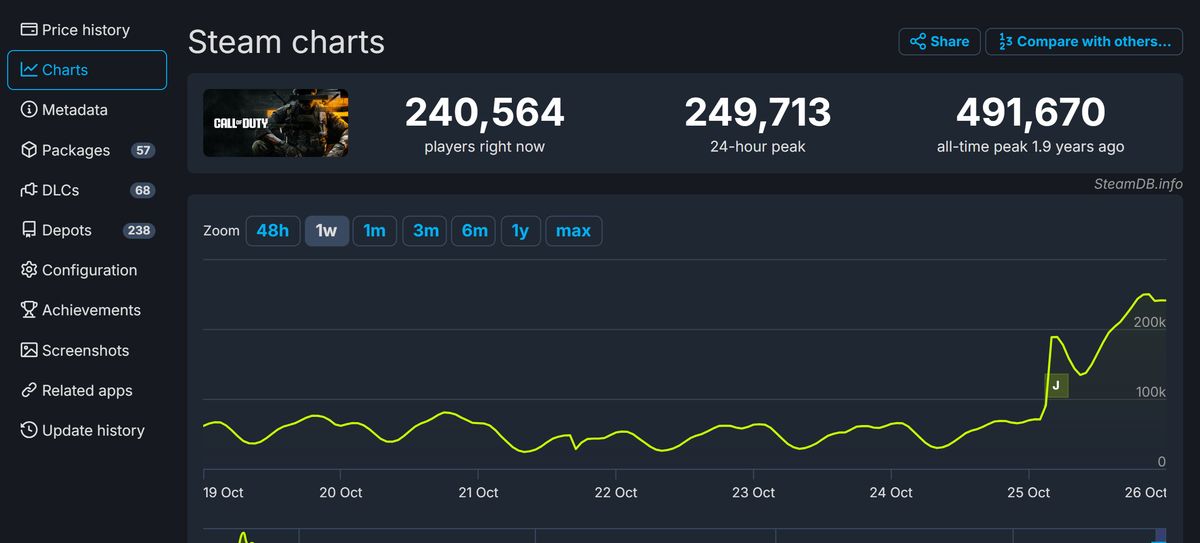 值得一提的是,SteamDB 49.1万的在线峰值并不是《使命召唤21:黑色行动6》,而是《使命召唤19:现代战争2》,这是因为《使命召唤》这款游戏已经很久没有更换客户端。