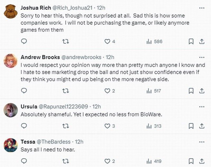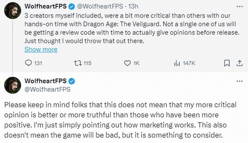 游戏博主WolfheartFPS在推特上发文称:“包括我在内的三位博主在此前《龙腾世纪4》前瞻中,比其他人更挑剔,因此被取消评测资格,没法在游戏发布前发表意见。”