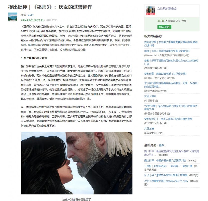 此外,CDPR经典游戏《巫师3》也被批“厌女”: