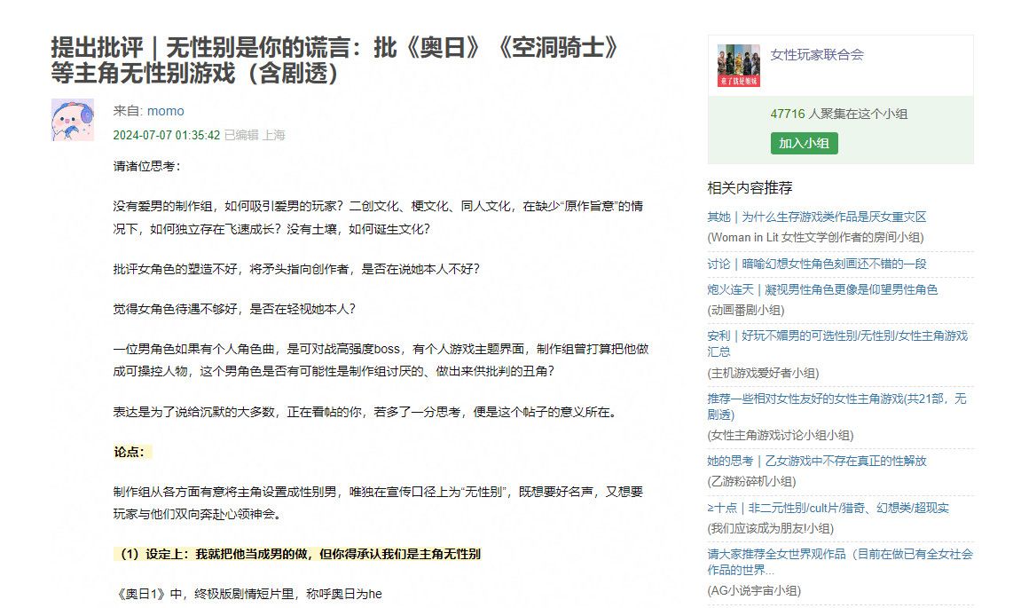 不过,今日国内社交媒体上有玩家发现豆瓣“女性玩家联合会”小组批评了这款“女性主角3A游戏”(《明末:渊虚之羽》)。发帖人认为《明末:渊虚之羽》的宣发侮辱女性和物化女性。