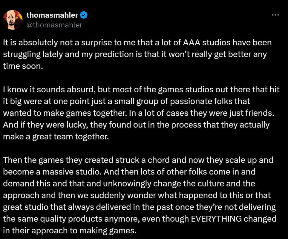 托马斯·马勒表示,AAA工作室目前的困境并不令人意外。他解释说,游戏的发展源于才华横溢的开发者的热情和兴趣,他们希望为粉丝提供真正令人愉悦的体验。