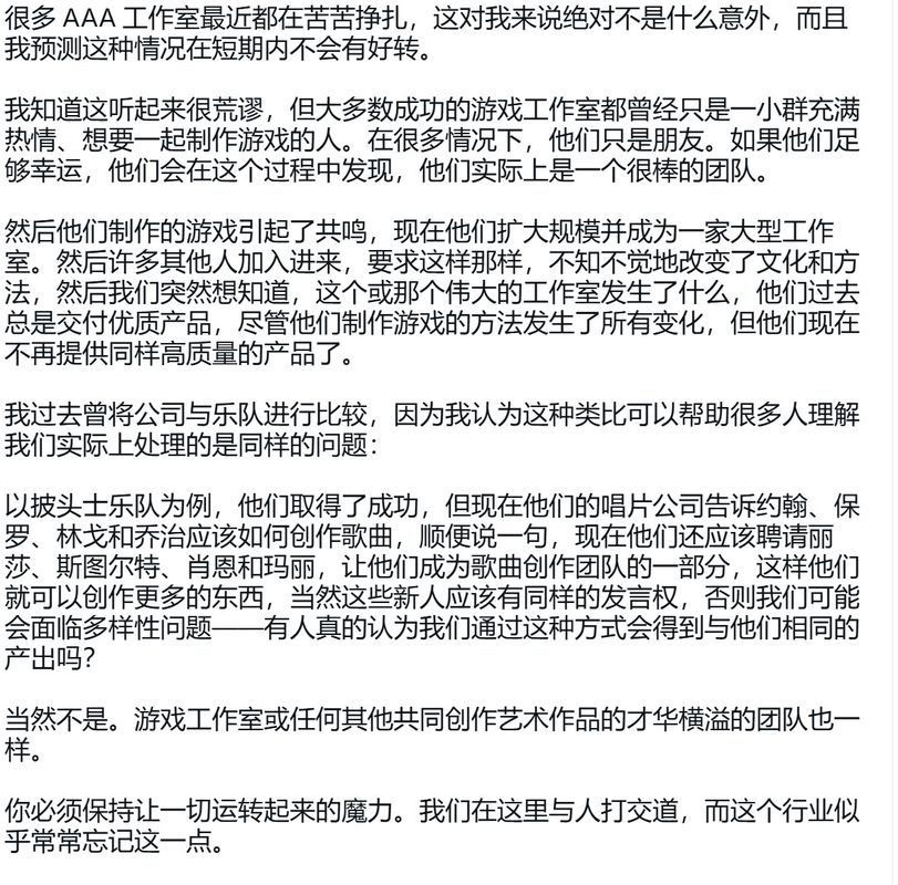 马勒认为,游戏行业的突然增长导致高管们专注于交付产品。他们现在干涉已建立的工作室,通常会彻底改变工作文化。他认为这种情况短期内不会好转。这就是为什么许多AAA团队不再保持过去的声誉。