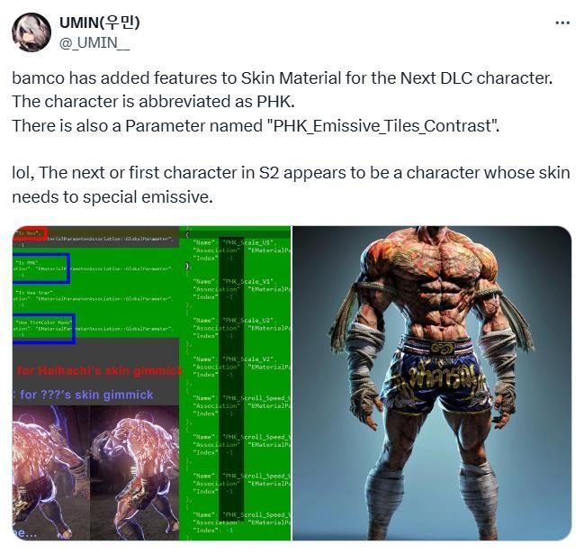 根据数据挖掘工_UMIN__分享的信息,万代南梦宫近日为《铁拳8》的下一个DLC角色添加了新皮肤材质功能,该角色代号为“PHK”,拥有一个名为“PHK_Emissive_Tiles_Contrast”的参数,这表明该角色拥有会发光的皮肤,考虑到这一点,有玩家推测“PHK”可能会是《铁拳7》中的泰拳冠军“法克拉姆”(Fahkumram),他的皮肤偶尔会发光和闪烁。