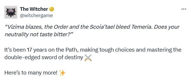 CDPR在社交媒体上发文展示了一张《巫师》发售17周年的贺图,并配文:“维吉玛在燃烧,教团和松鼠党让泰莫利亚流血。你们的中立难道不苦涩吗?我已经在这条路上走了 17 年,做出了艰难的选择,掌握了命运的双刃剑。祝您好运!”
