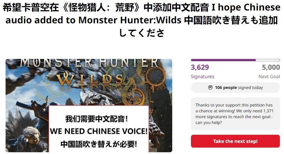 最近有玩家在请愿网站Change.org上发起请愿,呼吁卡普空在《怪物猎人:荒野》中加入中文配音。目前该请愿已获得3629人支持,下一个里程碑为5000人。