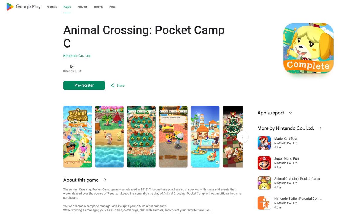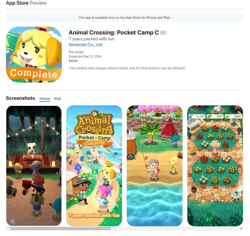 近日任天堂正式公布了买断制《动物森友会:口袋露营广场集合版》的上线时间,将于2024年12月3日登录iOS和安卓平台,目前已在双端的商城页面上线,并提供事前登录和预定,目前预定价格为9.99美元(iOS端,约合人民币71.3元)。