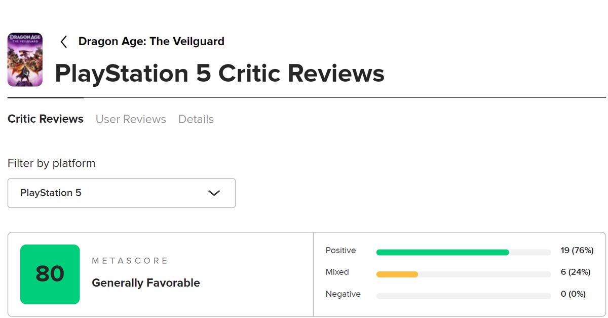 《龙腾世纪:影障守护者》即将正式发售,目前有关该作的评分已经解禁,截止发稿时,M站该作PC版评分88,PS5版评分80,但目前pc版仅六位媒体评分。