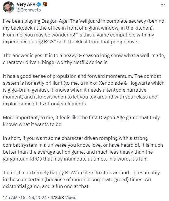 《龙腾世纪4:影障守护者》媒体评分已解禁,许多媒体和评测者对该作的评价纷至沓来。《博德之门3》发行总监Michael Cromwelp Douse也发推文,给予《龙腾世纪4》高度评价。他认为这是一款“真正知道自己想要成为什么样子的《龙腾世纪》”,值得RPG粉丝花时间去体验。