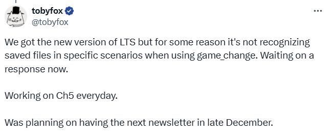 Toby Fox在文中表示,他和他的开发团队近日收到了开发引擎GameMaker LTS的新版本,但出于某种原因,游戏无法识别已存档的文件,因此他正在等待引擎开发人员对此的回应。而目前,他每天都在开发《三角符文》的第五章,计划在12月底发布下一期的开发简报。