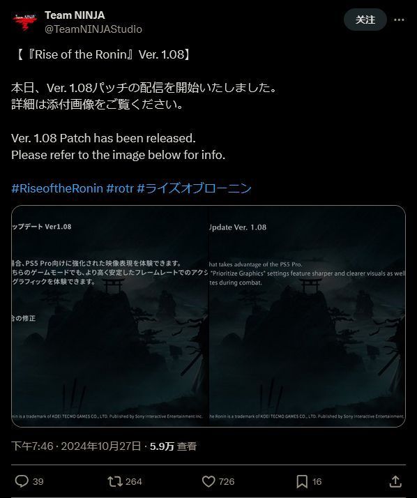 由忍者组开发的动作角色扮演游戏《浪人崛起》日前推出了1.08 版本更新,正式支持 PS5 Pro 主机。