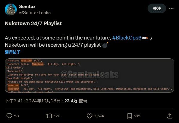 在每一款《使命召唤》中,每一代作品都会有一个全天候循环(24/7)小地图的模式。在一作品中这张地图是“混战码头”,其他作品中则是“核弹小镇”。11月 1日,最近刚刚推出的《使命召唤:黑色行动6》将获得经典小地图“核弹小镇”,而根据数据挖掘确认,全天候循环模式也将随其二至。