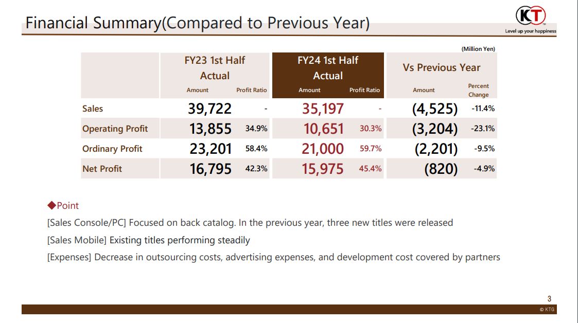 近日,光荣特库摩公布了2024年4月至9月上半财年的财报数据,其中显示,光荣特库摩本财年上半年销售额为351.97亿日元,较上财年同期下降11.4%,营业利润为106.51亿日元,较上财年同期下降23.1%,这是由于PC、主机、在线和移动设备游戏销量总体下降造成的。