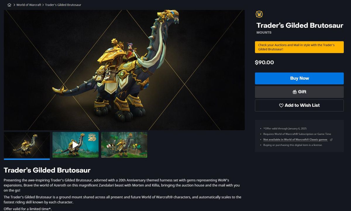 《魔兽世界》近日推出了一款售价高达90美元(国服上架包含雷龙坐骑和2000枚商栈币的礼包,售价为888元,美服仅包含坐骑)的全新坐骑“鎏金雷龙”,一时受到玩家的追捧。