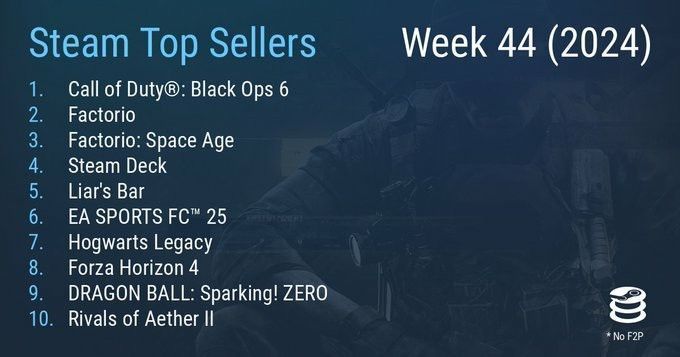 Steam最新一周销量榜出炉(2024年10月22日-2024年10月29日),本周《使命召唤:黑色行动6》成功登顶,终结了《七龙珠 电光炸裂!ZERO》的三连冠。