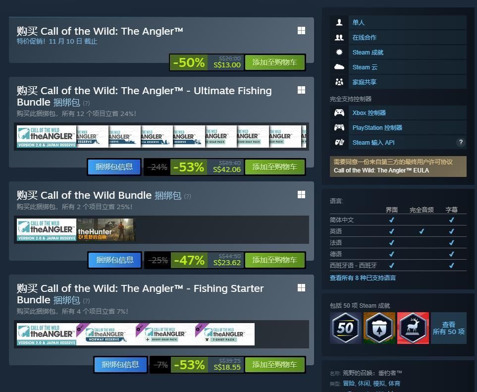 《荒野的召唤:垂钓者》“日本渔业保护区”已支持简体中文界面和字幕,Steam平台国区现价42元暂无折扣,不过《荒野的召唤:垂钓者》的本体和DLC正在限时特惠中。