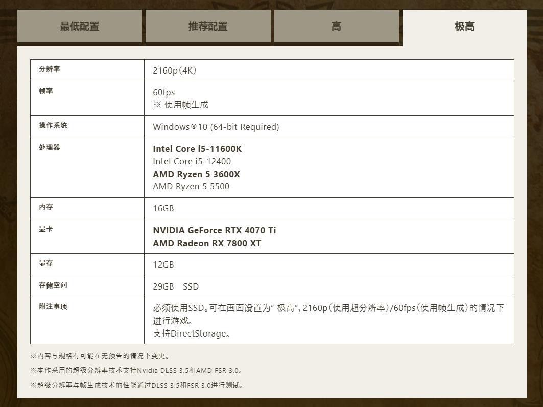 根据官网上的信息显示,以2K/60帧(画质设置“高”)运行《怪物猎人:荒野》需要CPU:i5-11600K或i5-12400或R5 3600X或R5 5500,显卡:RTX 4060Ti或RX 7700XT,并且还需要开启DLSS或FSR和帧生成。而4K情况下,以4K/60帧(画质设置“极高”)运行《怪物猎人:荒野》需要的CPU与2K设置下一致,但显卡要升级到RTX 4070Ti或RX 7800XT,一样也要开启DLSS或FSR和帧生成。