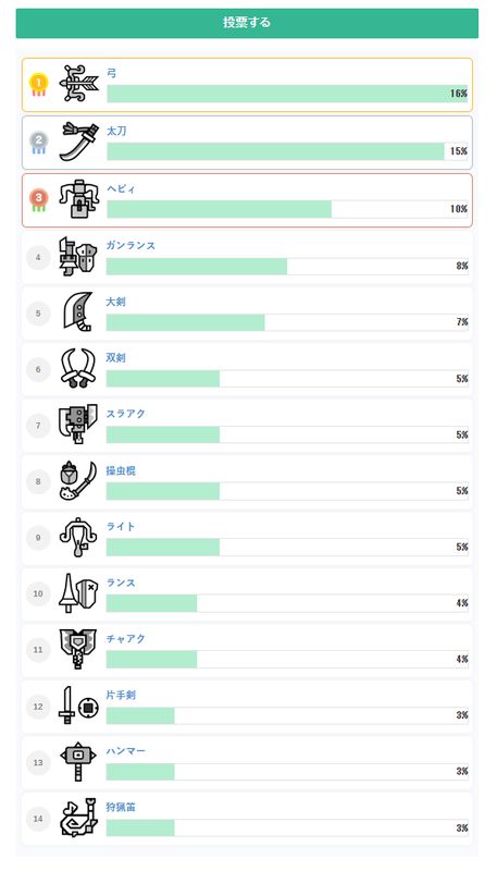 《怪物猎人:荒野》近日在PS5上开启了PS+会员抢先公测,日本知名游戏攻略网站Game With也开启了公测玩家武器选择投票,每位玩家可以选择自己认为最强的三种武器投票。截止到发稿,排名第一的武器是弓箭,第二是太刀,第三是重弩,而倒数第一则是长年垫底的狩猎笛,不过后三名片手、大锤和狩猎笛的选取率都是3%。