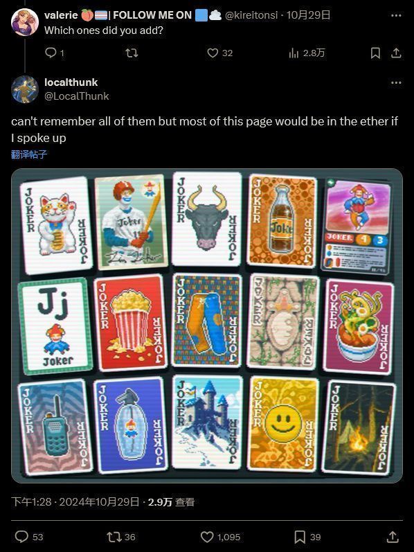 当玩家问他哪些是之后额外添加的时候,LocalThunk表示自己“记不清所有的牌了”,但分享了一张截图,并表示如果他当初指出了发行商的口误,“这一页里的大部分内容都会消失”。这一页里有很多非常棒的小丑牌,像是备用长裤(包含两对每次+2 倍率)、棒球卡(每张罕见小丑拍给予 x1.5 倍率)以及篝火等。