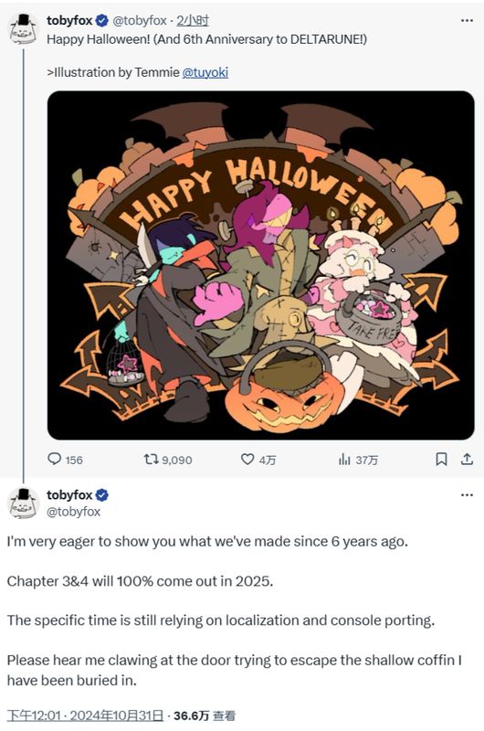 10月31日,《三角符文》游戏作者Toby Fox在社交媒体上发文庆祝了游戏公布六周年,同时正式确定《三角符文》第三章和第四章100%将于2025年发售,具体时间将取决于本地化和主机版移植进度。