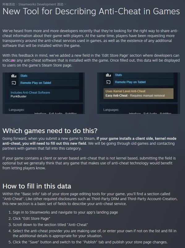 不仅如此,Steam方面还明确表示“如果你(指开发者)的游戏安装了客户端内核模式反作弊程序,你需要填写这个新字段”,并且填写该内容也将是此后Steam审查内容的一部分。