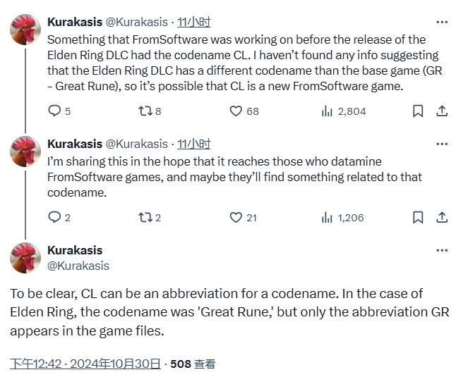 另外,Kurakasis还表示他不知道这个代号具体代表什么,他分享这个信息是为了传达给FromSoftware的数据挖掘工,也许有人能找到与该代号有关的信息。最后需要说明的是,“CL”是开发代号的缩写,例如《艾尔登法环》开发代号为“GR”,全称“Great Rune”,不过在游戏文件中只出现了缩写“GR”。