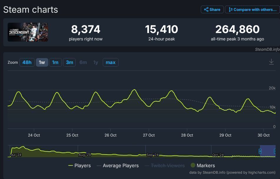 这些好看的角色设计以及这种倾听玩家诉求的官方,自然获得了许多的支持。虽然游戏在 Steam 上没有刚发售时的26 万人同时在线,但现在仍然有着平均上万人每天同时在线的热度。