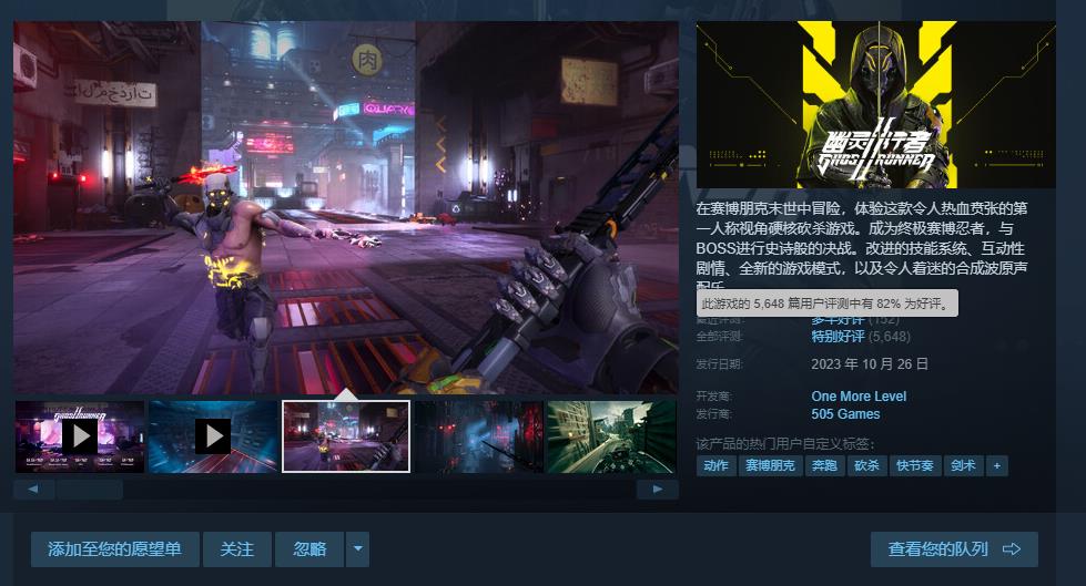 由One More Level进行开发、505 Games负责发行的爽快跑酷砍杀游戏《幽灵行者2(Ghostrunner 2)》,最初在2023年10月26日推出,游戏在Steam平台已收获总体82%好评率的特别好评。