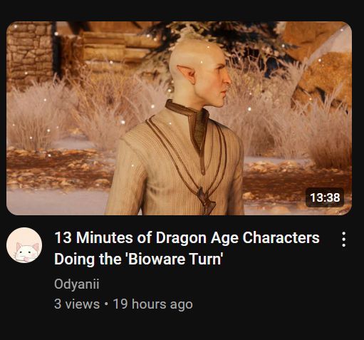 由BioWare打造的RPG游戏《龙腾世纪:影幛守护者》即将发售,近日有玩家上传了包含《龙腾世纪》系列(实际上此人也制作了《质量效应》系列的同类型视频)游戏中许多角色在对话的过场中选择转身离开的场面进行了剪辑,累计时长超过13分钟,并将这种固定演出称之为“生软转身”。