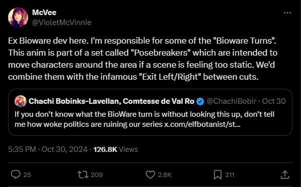 随后曾在BioWare担任电影设计师的McVinnie于个人推特上对这个生软惯用“套路”做出了解释,她表示:“这个动画是名为‘Posebreakers’系列的一部分,旨在当场景感觉太静态时移动角色,我们会剪辑进去将它们与臭名昭著的‘左/右退出’结合起来。”