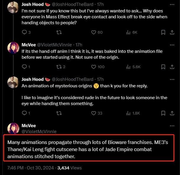 实际上不仅仅是过场中存在素材复用,McVinnie还指出在《质量效应3》中Thane/Kai Leng的战斗过场动画,就有很多是利用BioWare早期作品《翡翠帝国》中的战斗动画拼接而成的。