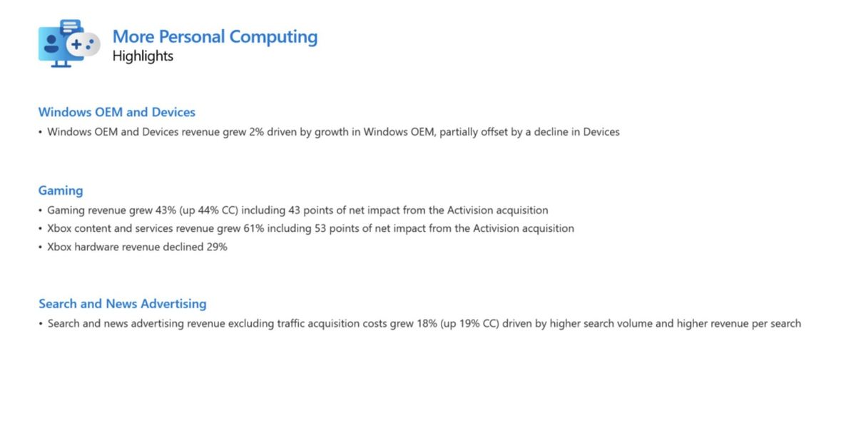 自收购动视暴雪以来,Xbox游戏收入增长了43%,其中所有游戏收入都来自动视。此外,Xbox内容和服务收入增长了61%,其中53个点的净影响来自于对动视的收购。虽然报告中没有具体说明,但可以推测增长来自Game Pass。这也在意料之中,因为动视的一些游戏首次出现在订阅服务中。这是使用订阅服务的用户首次能够通过 Game Pass玩到《使命召唤》游戏,因为《使命召唤:黑色行动6》已作为首日发售游戏加入该服务。此外,用户还将获得《使命召唤:现代战争3》和《战争地带》。