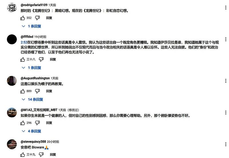 《龙腾世纪:影障守护者》对觉醒文化非常热衷,NPC特别喜欢搞“身份认同”。玩家发现,在一个过场动画中,如果你认错了某个NPC的性别,其他人会对你训斥2分钟,教你如何道歉。