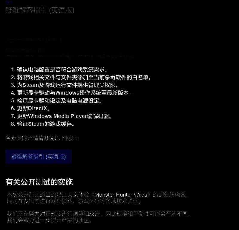 面对部分PC玩家遇到的一些问题,Capcom发布了《怪物猎人:荒野》BETA公测“疑难解答指引”和“注意事项”,列出了排查问题的8个步骤。