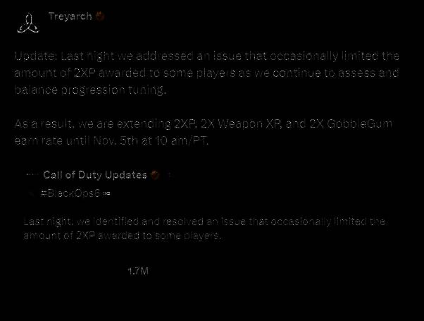 除此之外,Treyarch随后还宣布将延长《使命召唤21:黑色行动6》的双倍经验奖励活动,现持续到太平洋时间11月5日上午10点,也就是北京时间11月6日凌晨2点。