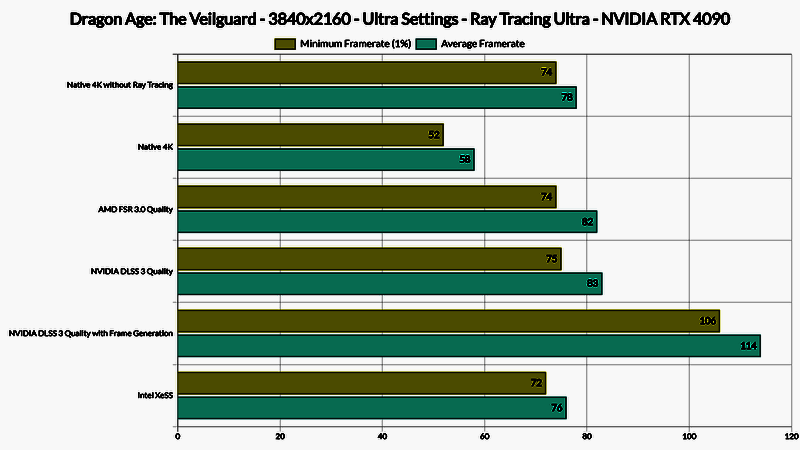 外媒DSOGaming使用RTX 4090对最近发售的《龙腾世纪:影障守护者》进行了测试,发现这款游戏可以在原生4K、不开启光追的情况下实现稳定70FPS的流畅体验:最低74FPS,平均78FPS。而在最高画质下开启光追后,性能下降至52/58FPS。