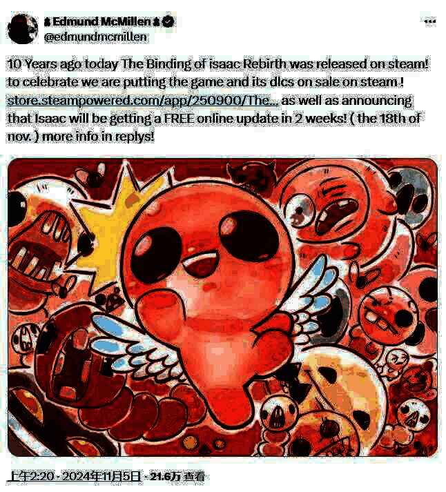 10年前的11月5日,动作类角色扮演游戏《以撒的结合:重生》正式在Steam上发售,作者Edmund McMillen今天发文庆祝了游戏发售10周年,作为10周年纪念的一部分,Edmund McMillen宣布《以撒的结合:重生》将在两周后(11月18日)发布一个免费在线更新,为游戏添加完整的在线合作模式(2-4人),同时对游戏进行大范围的平衡调整,重点增强一些玩家们认为平淡无奇或很糟糕的物品。