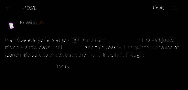 BioWare官方在近日发布推文表示:“希望大家在《龙腾世纪:影幛守护者》中玩得开心。距离‘N7日’只有几天了,今年因为(新游戏的)发布会比较安静。不过,到时候一定要回来看看,享受一点乐趣!”