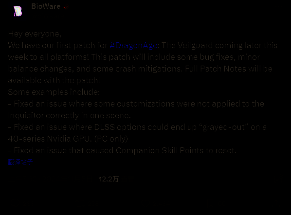开发商 BioWare 日前宣布了《龙腾世纪:影障守护者》更新,将于“本周晚些时候”登陆 PC、PS5、Xbox Series X|S。