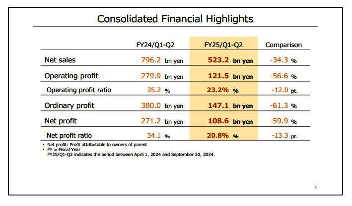 11月5日,任天堂发布了截止到2024年11月的财务业绩报告,涵盖了其本财年前六个月(Q1和Q2两个季度)的数据,其中销售额为5232亿日元,同比下降34.3%,营业利润为1215亿日元,同比下降56.6%,前两个季度共售出470万台Switch,而去年同期为680万台,目前Switch总销量已达1.4604亿台。