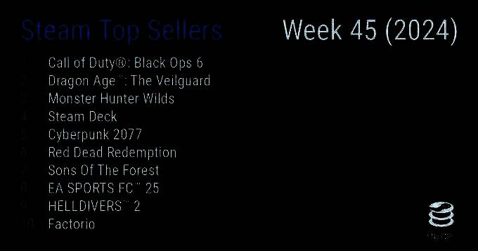 Steam最新一周销量榜出炉(2024年10月29日-2024年11月5日),本周《使命召唤:黑色行动6》再次登顶,达成二连冠,《怪物猎人:荒野》预购和新发售的《龙腾世纪:影障守护者》《荒野大镖客》也登上了榜单。